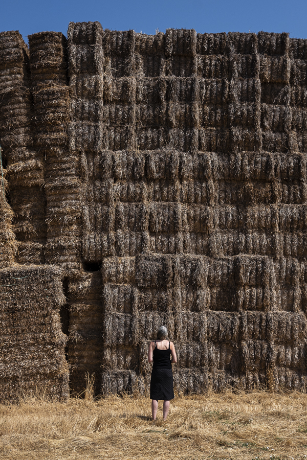 Encontramos uma torre magistral de fardos de palha que parece uma mansão. Alguém poderia viver ali dentro se fosse oca. Com certeza que não será ou os fardos de palha tombariam, mas a ideia dá largas ao imaginário e rodeamos a torre à procura de uma porta de entrada inexistente.