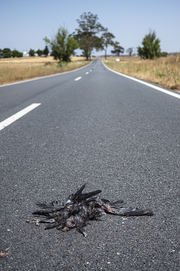 De manhã, continuamos pelo asfalto quente. Aljustrel e Castro Verde passam-nos através das janelas. A estrada aparece-nos com oliveiras a fazer-lhe sombra. Há bichos mortos ao longo do alcatrão, cegonhas em ninhos nos postes e insectos que voam à nossa volta quando saímos do carro.